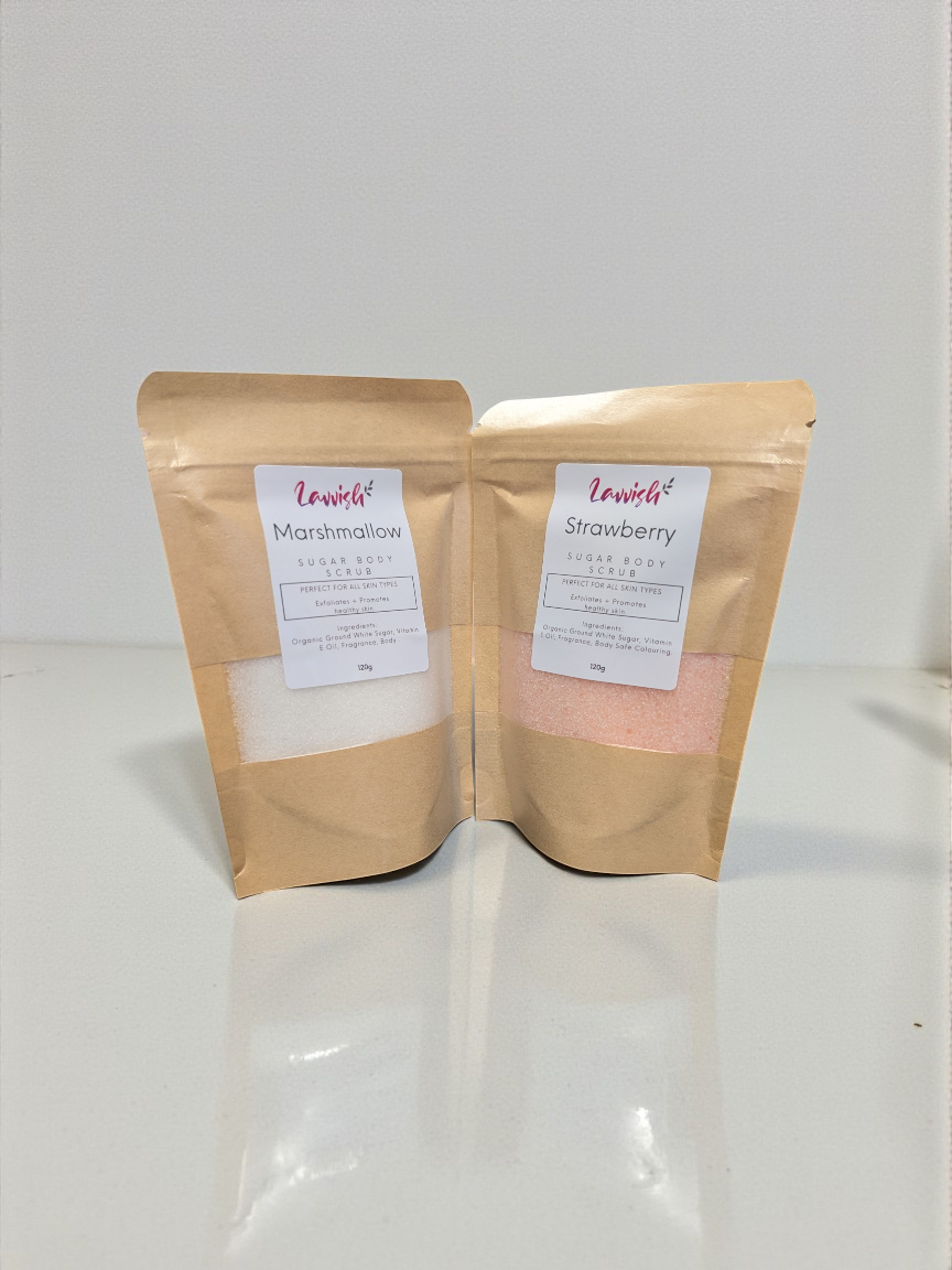 PINK Strawberry or Marshmallow Ingredients: Organic Ground White Sugar, Vitamin E Oil, Fragrance. Theres body safe colouring in the Strawberry one. Sugar scrubs brighten tired, dull-looking skin to promote healthy, smooth, and flawless skin. Sugar scrubs also fight skin aging in a natural way. Another benefit of a sugar scrub is that it can be used all over the body, not just the face. Just like the face, the body needs exfoliation, too!